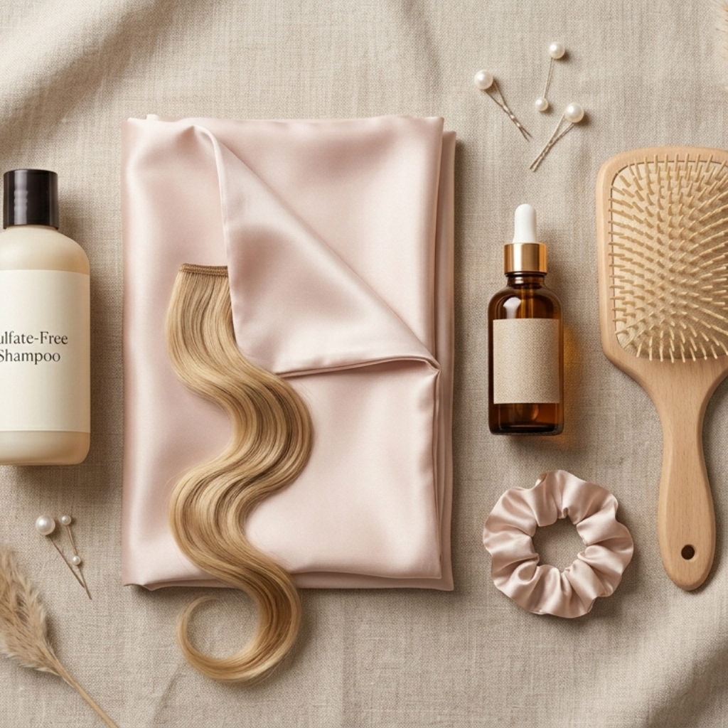 Before sleeping, put your hair in a loose braid or a low, loose ponytail — this prevents the tangling that can develop when extension hair moves freely during sleep and reduces the mechanical stress on the attachment points from repeated friction against the pillow. A silk or satin pillowcase further reduces friction and is one of the most consistent recommendations for extension wearers. Never sleep with wet extension hair — always ensure the hair is completely dry before going to bed.